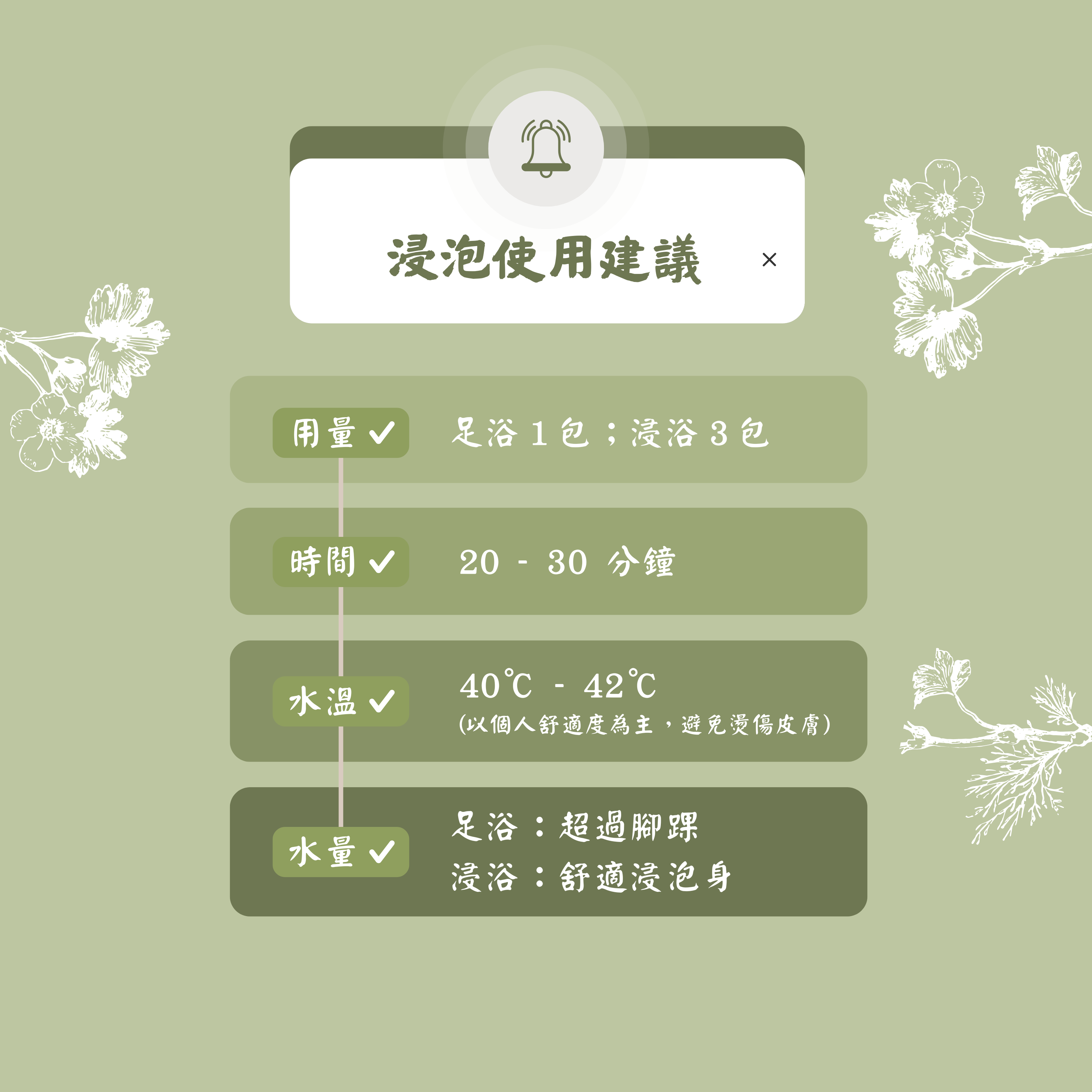 [ 成份 ] 紅花 砂仁 蒼朮 厚朴 威靈仙 花椒 茯苓 藿香 茵陳 佩蘭 艾葉 老薑